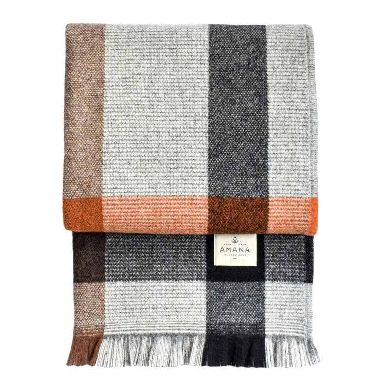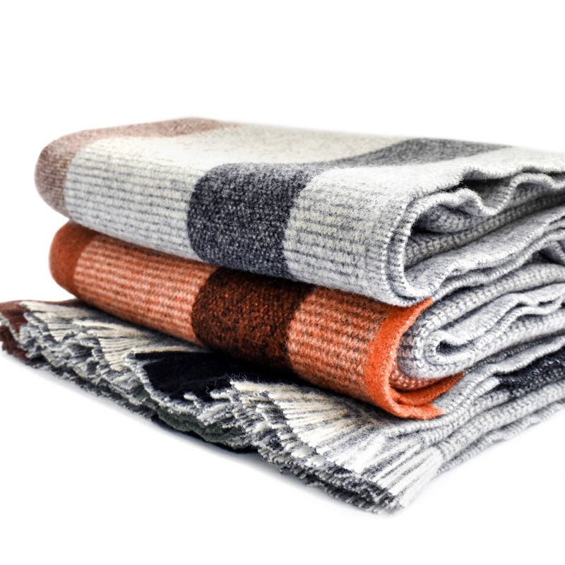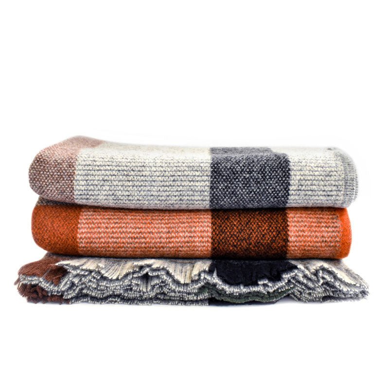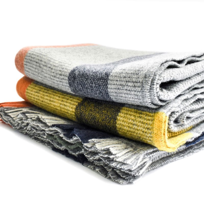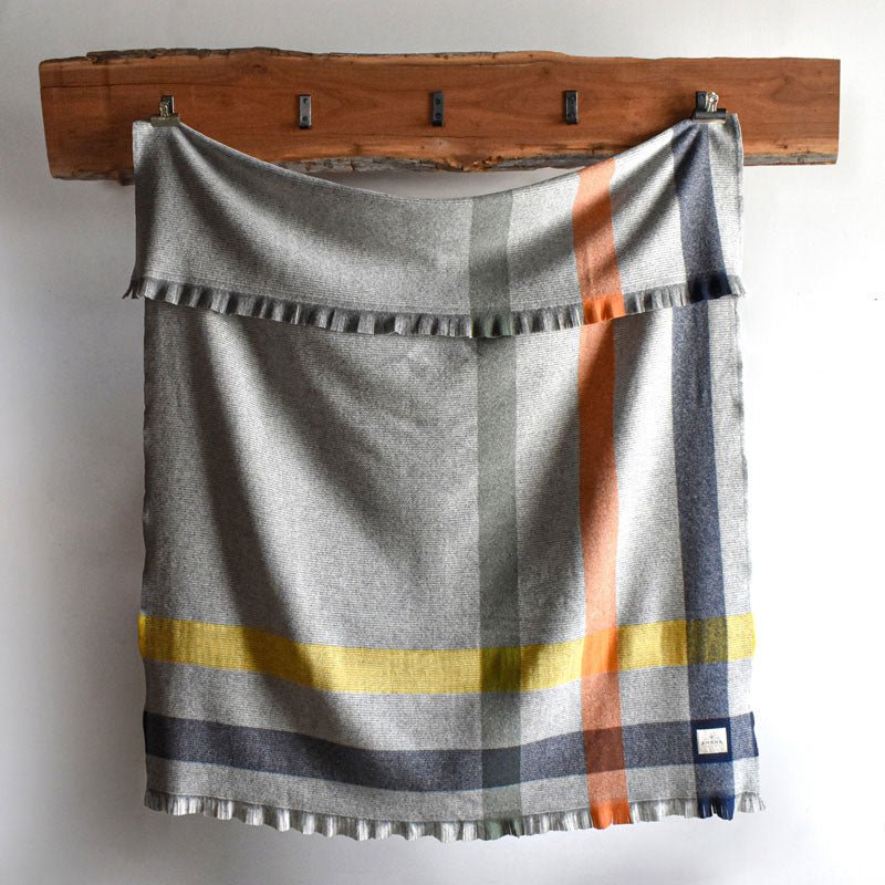 The Wilde Wool Throw Blanket is a masterful blend of comfort and design, a gray base featuring an intricate weave pattern is accented by striking bands of color. Crafted from 100% wool, it provides superior warmth and durability, making it a distinguished choice for those seeking both functionality and a personal touch of style in their home.